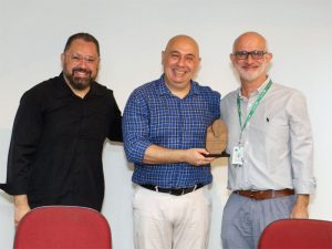 Na edição de 2024, Edson Salvo Melo e Dr. Luiz Mário Pereira de Souza Gomes premiam o Dr. Ricardo Peres do Souto, representante do NUBEM-FMABC