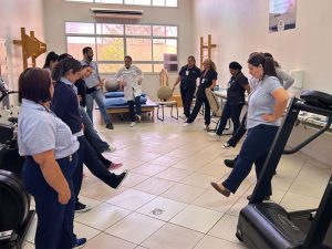 O Ambulatório Médico de Especialidades (AME) Dr. Oscar Gurjão Cotrim, em Araçatuba, sob gestão da Fundação do ABC em parceria com o Governo do Estado de São Paulo, incluiu a ginástica laboral na rotina de seus colaboradores como estratégia de promoção da saúde e valorização dos profissionais. A iniciativa ocorre todas as quintas-feiras, nos períodos da manhã e da tarde, com orientação da equipe de Fisioterapia do próprio ambulatório.