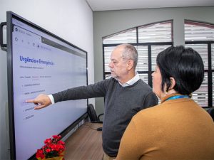 Os equipamentos têm telas touchscreen (sensíveis ao toque), com interface intuitiva, que permitem ao usuário navegar desde a triagem até exames clínicos e de imagem, auxiliando o atendimento do médico – do outro lado, profissionais da rede andreense comandam a consulta diretamente do Centro de Saúde Escola (CSE) Capuava.