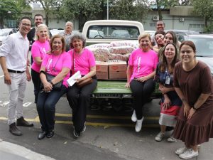 Colaboradores da FUABC e da ONG Rede Feminina de Combate ao Câncer posam entre os donativos