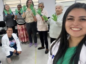 A ação também foi replicada junto ao Grupo de Convivência de Idosos da unidade, que participou com entusiasmo da atividade prática. Entre risadas, curiosidade e descobertas, os idosos puderam compreender a importância do gesto simples de lavar as mãos corretamente como forma de prevenção de doenças e fortalecimento da autonomia no autocuidado.