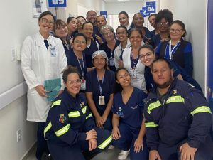 Participaram da condução da capacitação as enfermeiras Taciane Freitas, responsável pela Educação Continuada em Enfermagem, e Daniela de Souza, do Núcleo de Emergência e Urgência, além do técnico de enfermagem Victor Vitória e da coordenadora de Enfermagem, Maria Silmara Rosenblat.
