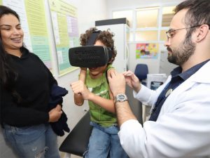 A utilização é simples. A criança coloca os óculos, é iniciada a exibição de um vídeo interativo em 360º a partir de uma realidade virtual e essa distração auxilia para que o profissional consiga aplicar os imunizantes.